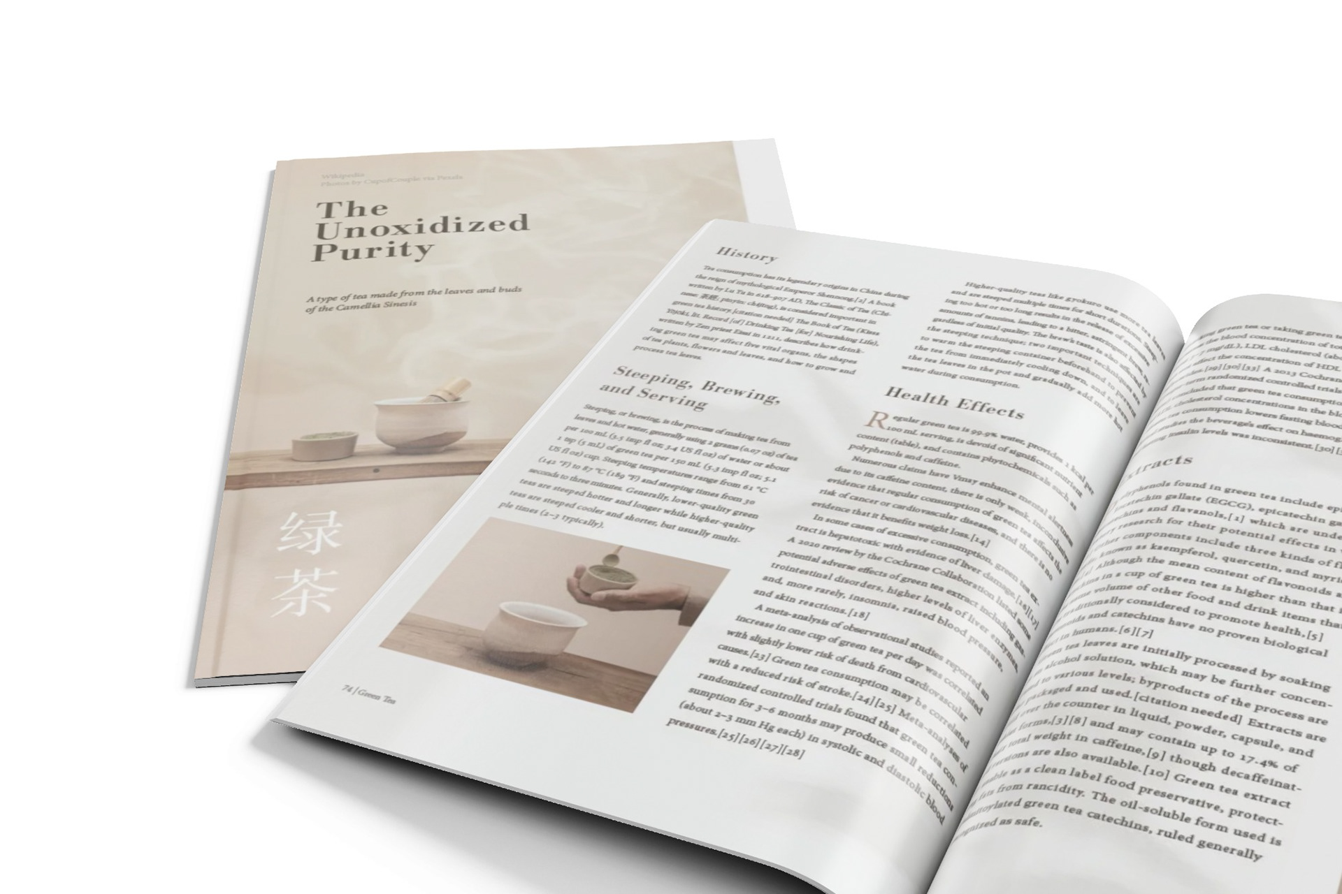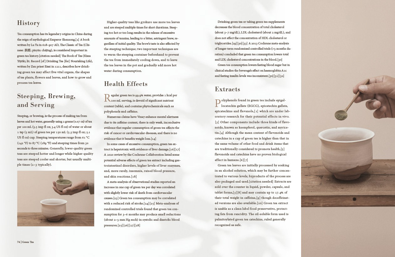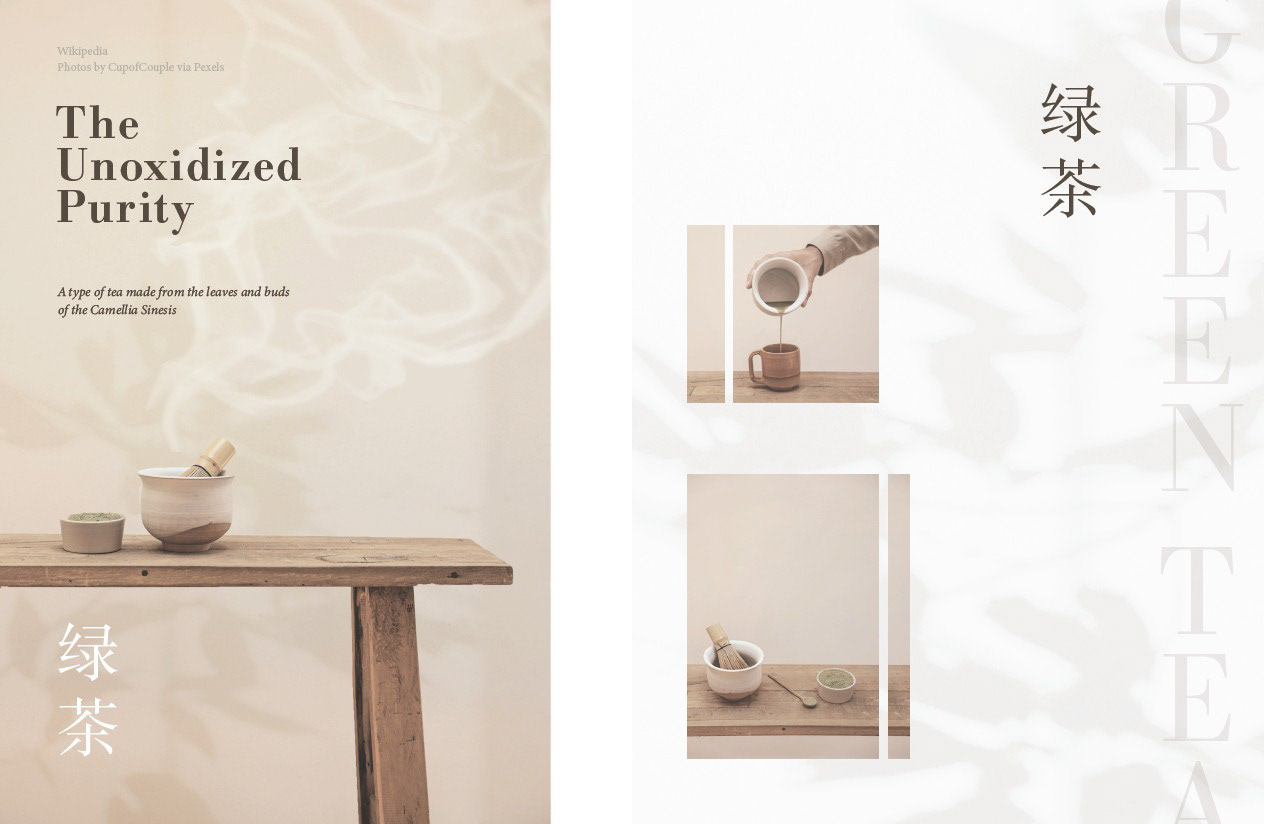 In this editorial magazine layout, I explored the topic of green tea through online research in order to curate a set of sub-topics to be used for a hypothetical article. Through ideation and iteration, I created a layout utilizing thoughtful imagery and typographic choices which evoked the specific sense of minimalism, calm, and serenity which I felt best defined green tea.