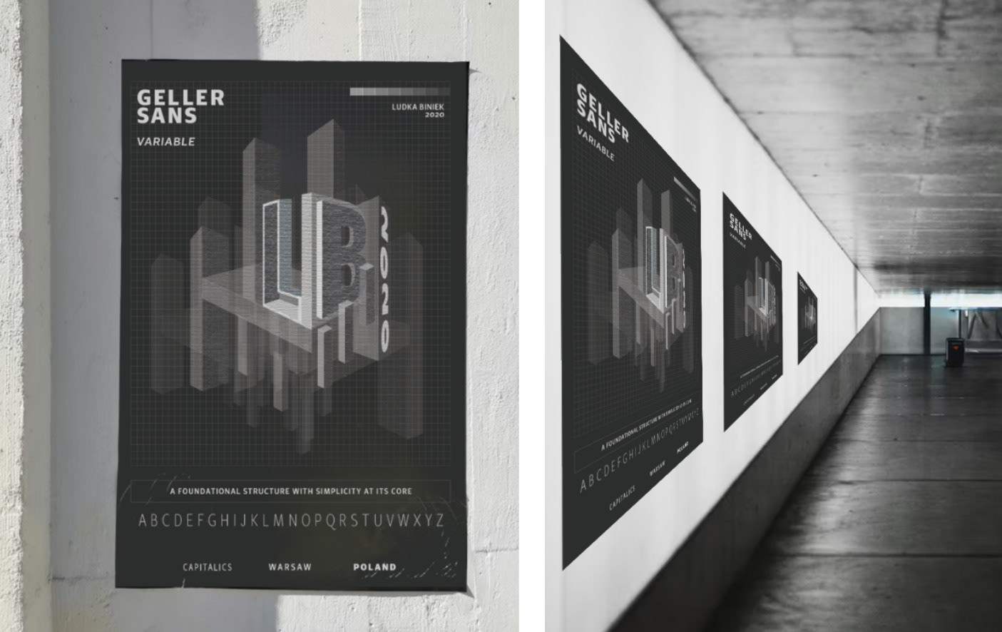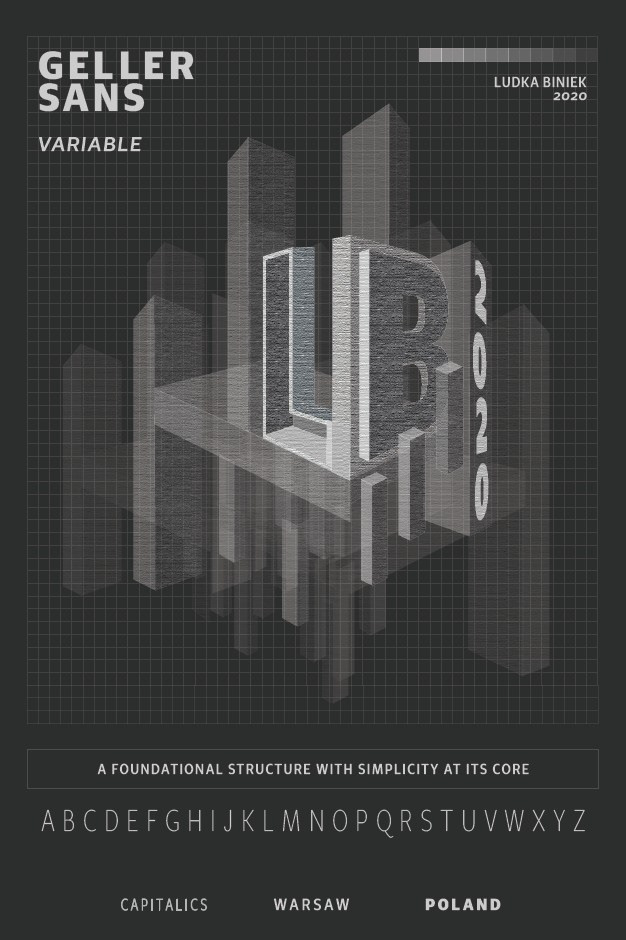 A large poster design meant to showcase the contemporary typeface "Geller Sans" by Ludka Biniek, 2020. Evaluating the typeface's structural and modular quality, a brutalist and architectural approach was taken to effectively and visually communicate the typeface's uniquely industrial character.
